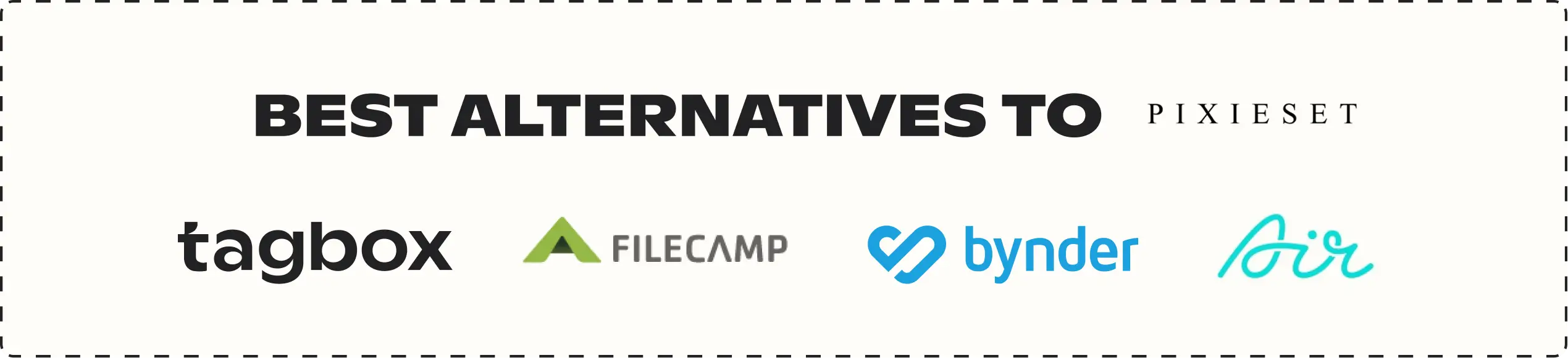 The top alternatives to Pixieset include Tagbox.io, Bynder, Air.inc, Filecamp, and Canto.